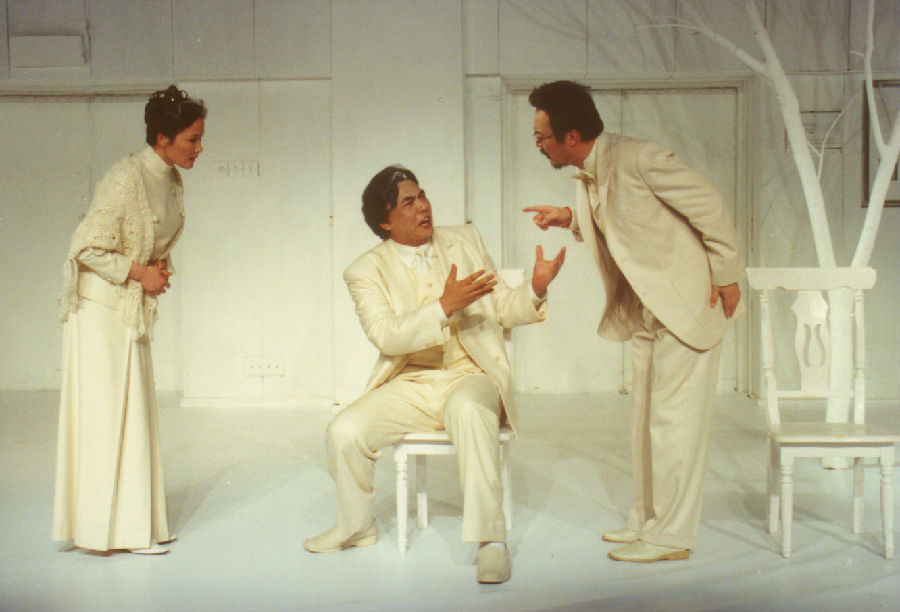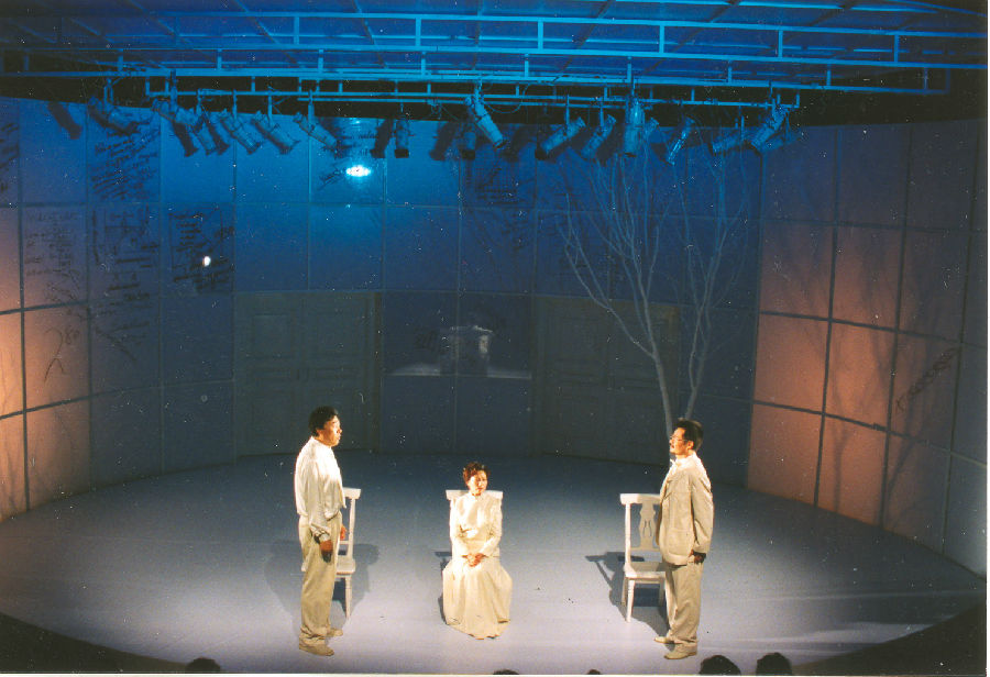 白色的椭圆形舞台,白色的墙壁,嵌在白色墙壁里可以随时打开的两扇门。这两扇门隔开了两个世界,门外是金色的白桦林,那是人的世界;门内是白色的冥界,灵魂游走聚首之地。一株枯索的白桦树,三只象牙般洁白的椅子,三个死后聚首的灵魂。