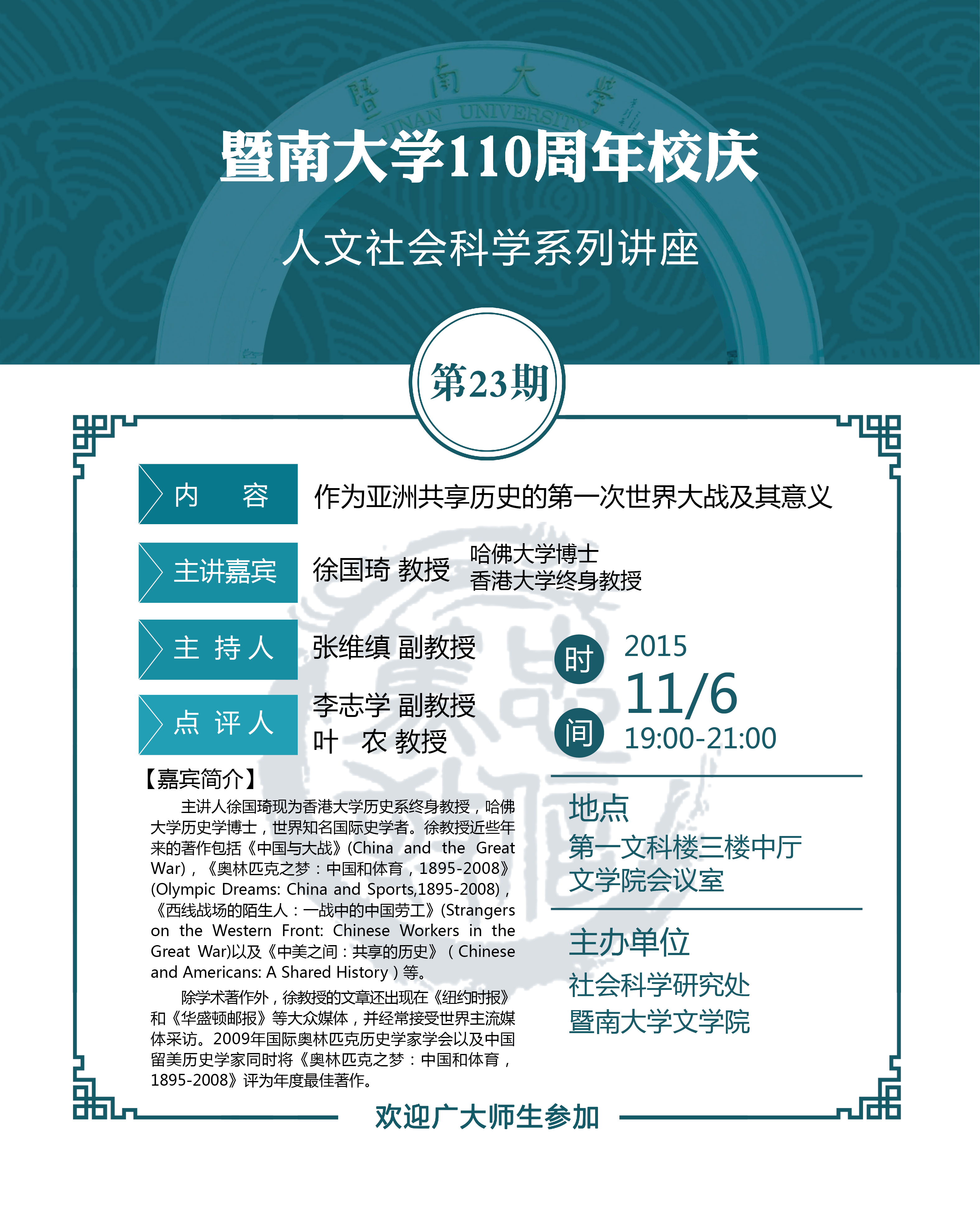 必威平台,必威(中国)一站式服务平台110周年校庆人文社会科学系列讲座第23期:作为亚洲共享历史的第一次世界大战及其意义