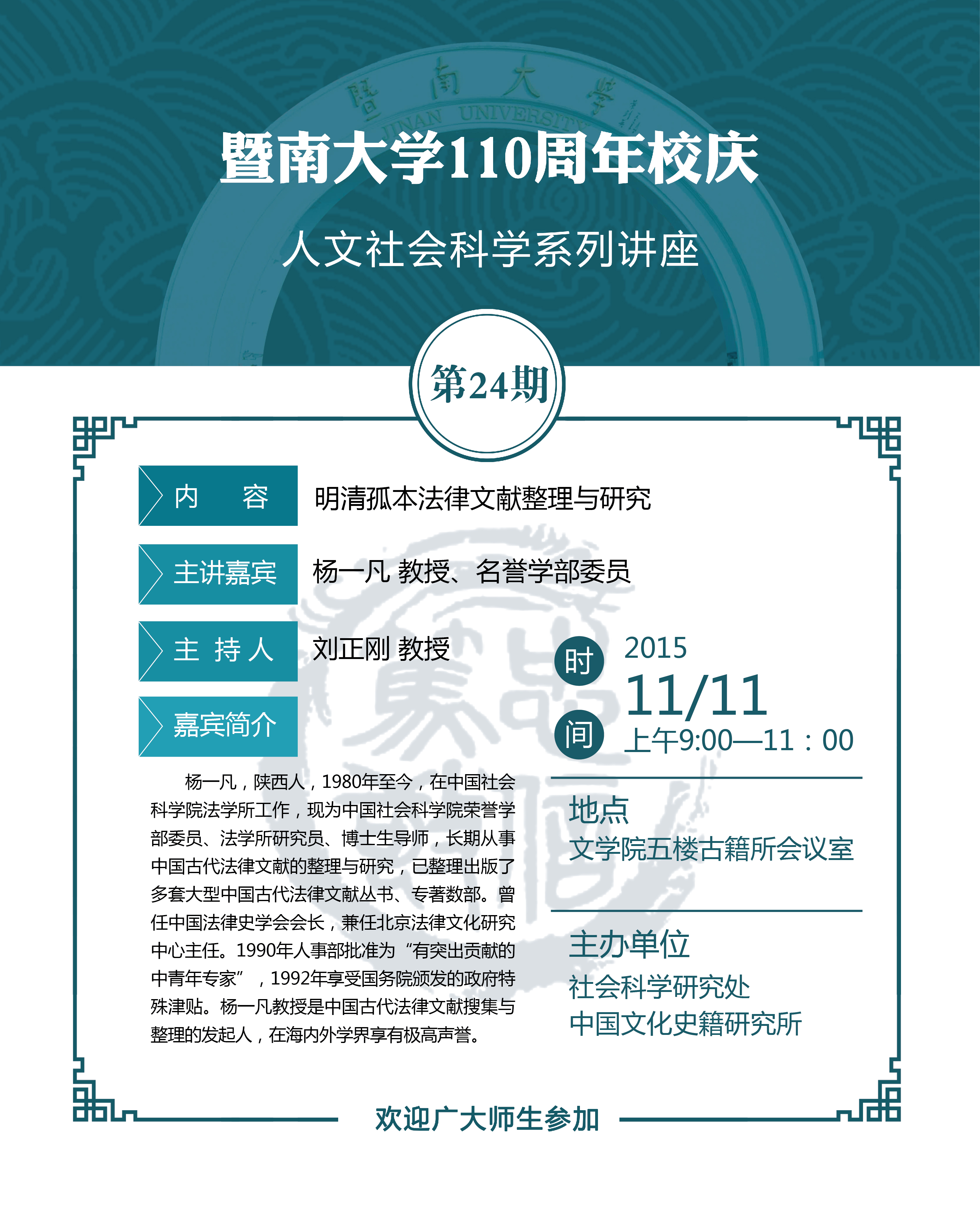 必威平台,必威(中国)一站式服务平台110周年校庆人文社会科学系列讲座第24期:明清孤本法律文献整理与研究