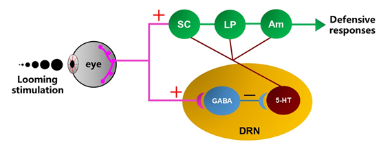 该研究发现视网膜内存有一类可同时投射至上丘(SC)和背侧中缝核(DRN)的神经节细胞,而且它们能够特异感知并传递迫近性威胁刺激(Looming stimulation)。当该类细胞激活时,一方面可通过启动上丘(SC)—丘脑外侧后核(LP)—杏仁核(Am)神经通路来诱发防御反应,另一方面还可通过抑制DRN的五羟色胺(5-HT)神经元进而保证防御反应的顺利执行。