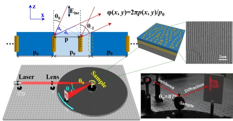 受传统全息光学里的迂回相位启发,此EOD超构光栅通过调控金属纳米棒在每个周期内的位移量实现0~2π连续阶相位的调控,其调制的相位与位移量呈线性关系,而不依赖于入射光波长与入射角。不同于传统迂回相位中通光孔径衍射效率低、出现孪生像等缺点,此超构光栅采用精心设计的金属纳米棒替代传统的通光孔结构,金属纳米棒的局域表面等离激元共振效应可以将光衍射效率增强到90%以上,并完全抑制0级光的出现。另一方面,由于加工超表面结构的纳米制备技术(如EBL, FIB等)在控制纳米结构位置的精准度,比控制纳米结构形状与大小要高得多,此位移编码型超表面能大大降低超表面的制备难度与成本,为宽角度范围波前调控,全景全息等应用提供了优良平台。