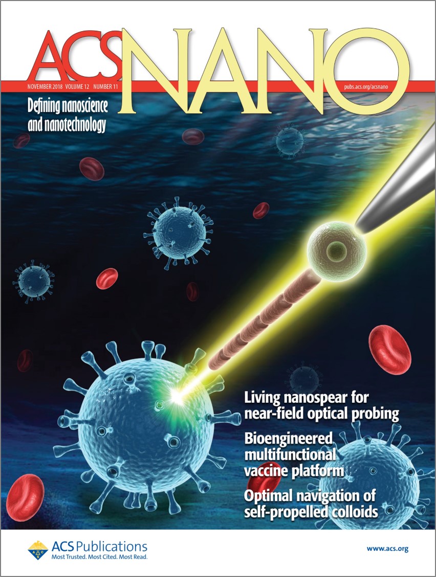 近日,纳米光子学研究院教授李宝军、副教授李宇超及其合作者利用光操控技术成功组装出一种生物兼容的纳米光学探针,实现了对人体血液中白血病细胞的高精度探测,相关成果发表在国际著名学术期刊 ACS Nano(IF=13.7),并被选为该期封面,ACS Nano还在In Nano专栏以“It's alive! Living nanoprobes made of cells”为题对该成果进行了报道。李宇超副教授为论文第一作者,李宝军教授为共同通讯作者。至此,该团队已有11篇论文被选为国际著名学术期刊封面或内封面。