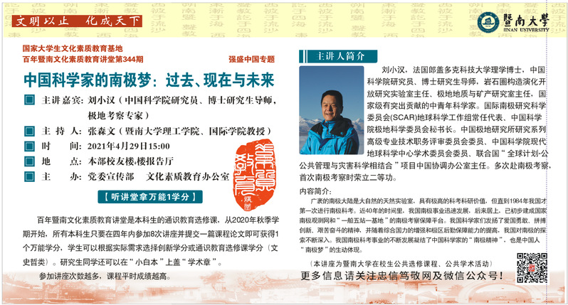 百年暨南文化素质教育讲堂第344期:中国科学家的南极梦:过去丶现在与未来