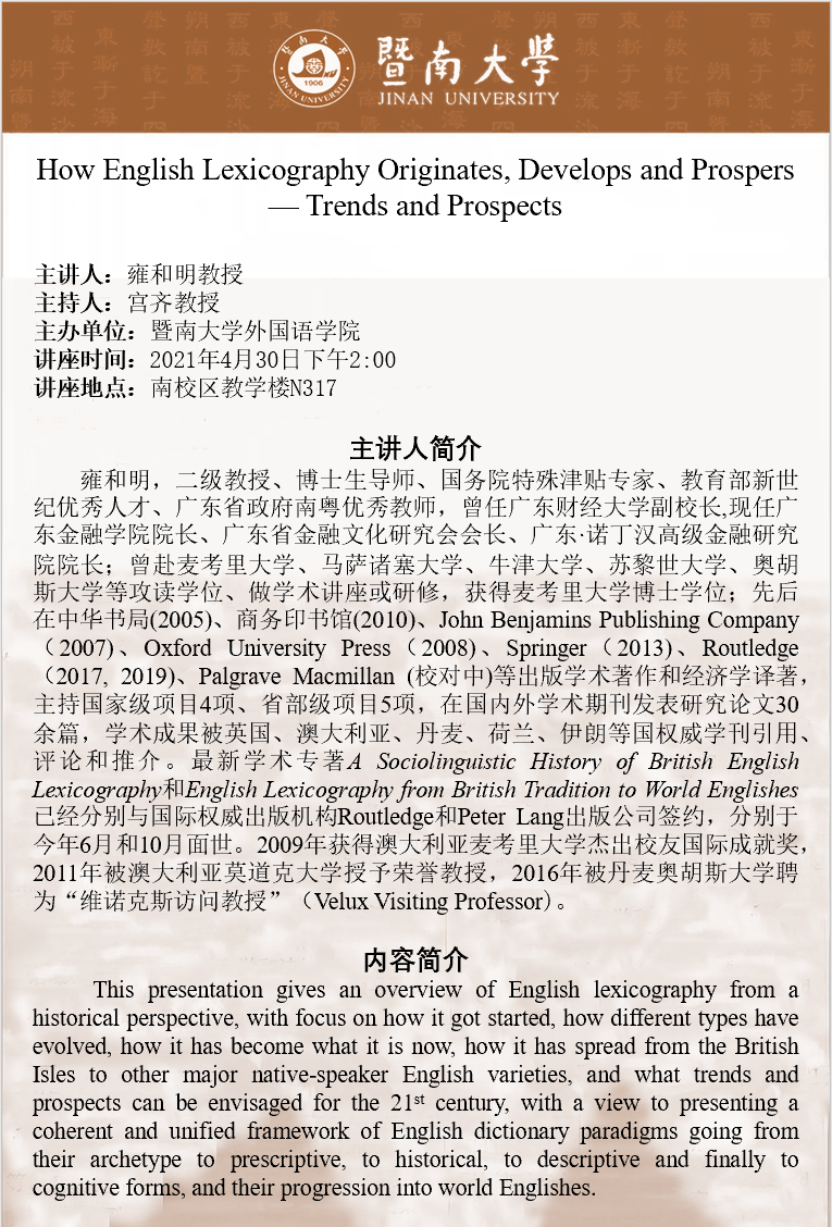 外国语学院讲座:英语词典学的起源、发展、现状与前景