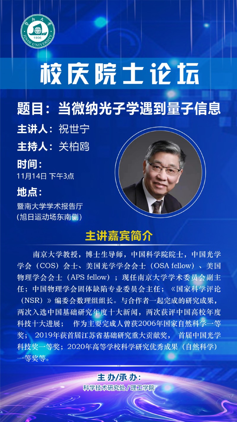 祝世宁,南京大学教授,博士生导师, 中国科学院院士,中国光学学会(COS)会士、美国光学学会会士(OSA fellow) 、 美国物理学会会士(APS fellow);现任南京大学学术委员会副主任;中国物理学会固体缺陷专业委员会主任;《国家科学评论(NSR)》编委会数理组组长。与合作者一起完成的研究成果,两次入选中国基础研究年度十大新闻,两次获评中国高校年度科技十大进展;作为主要完成人曾获2006年国家自然科学一等奖;2019年获首届江苏省基础研究重大贡献奖,首届中国光学科技奖一等奖;2020年高等学校科学研究优秀成果(自然科学)一等奖等。