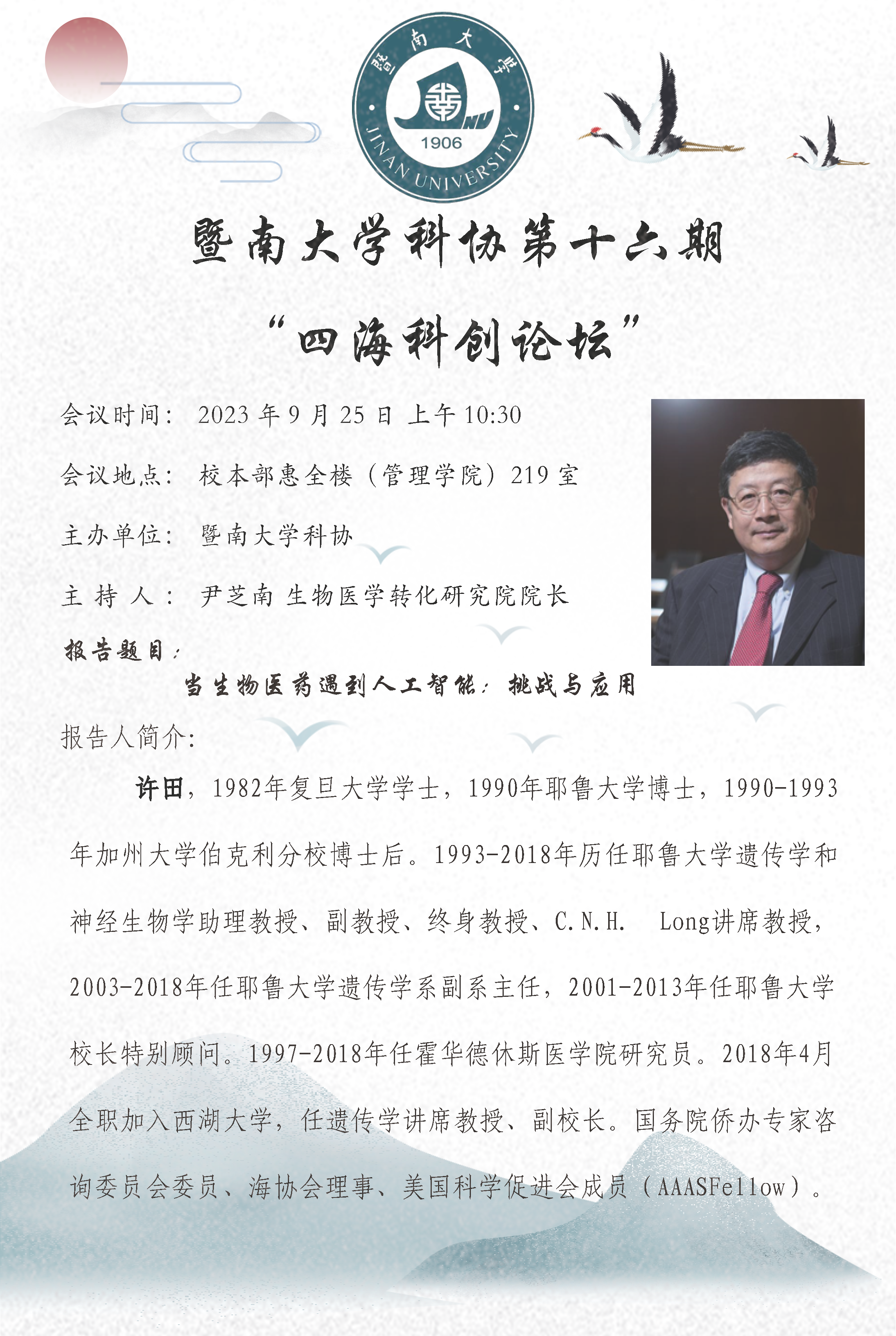 必威平台,必威(中国)一站式服务平台科协第十六期“四海科创论坛”:许田:当生物医药遇到人工智能:挑战和应用