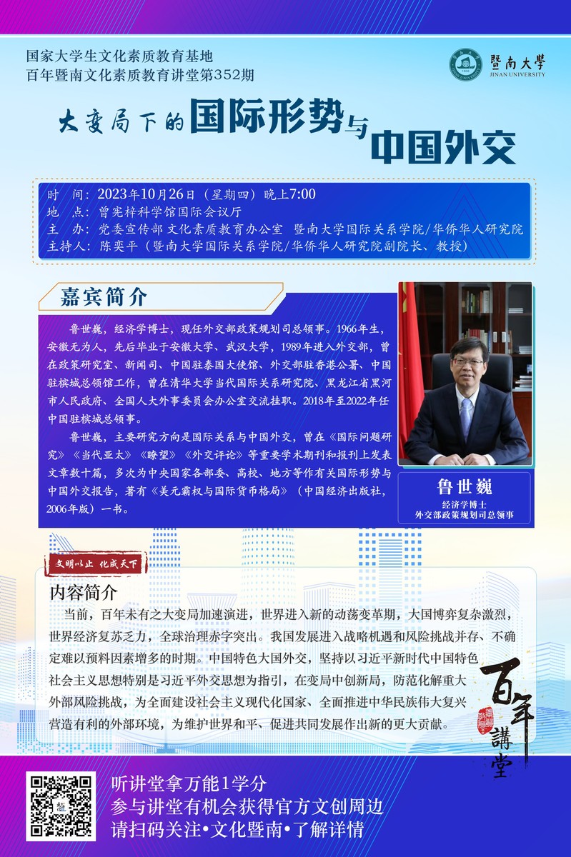 百年暨南文化素质教育讲堂第352期:鲁世巍:大变局下的国际形势与中国外交