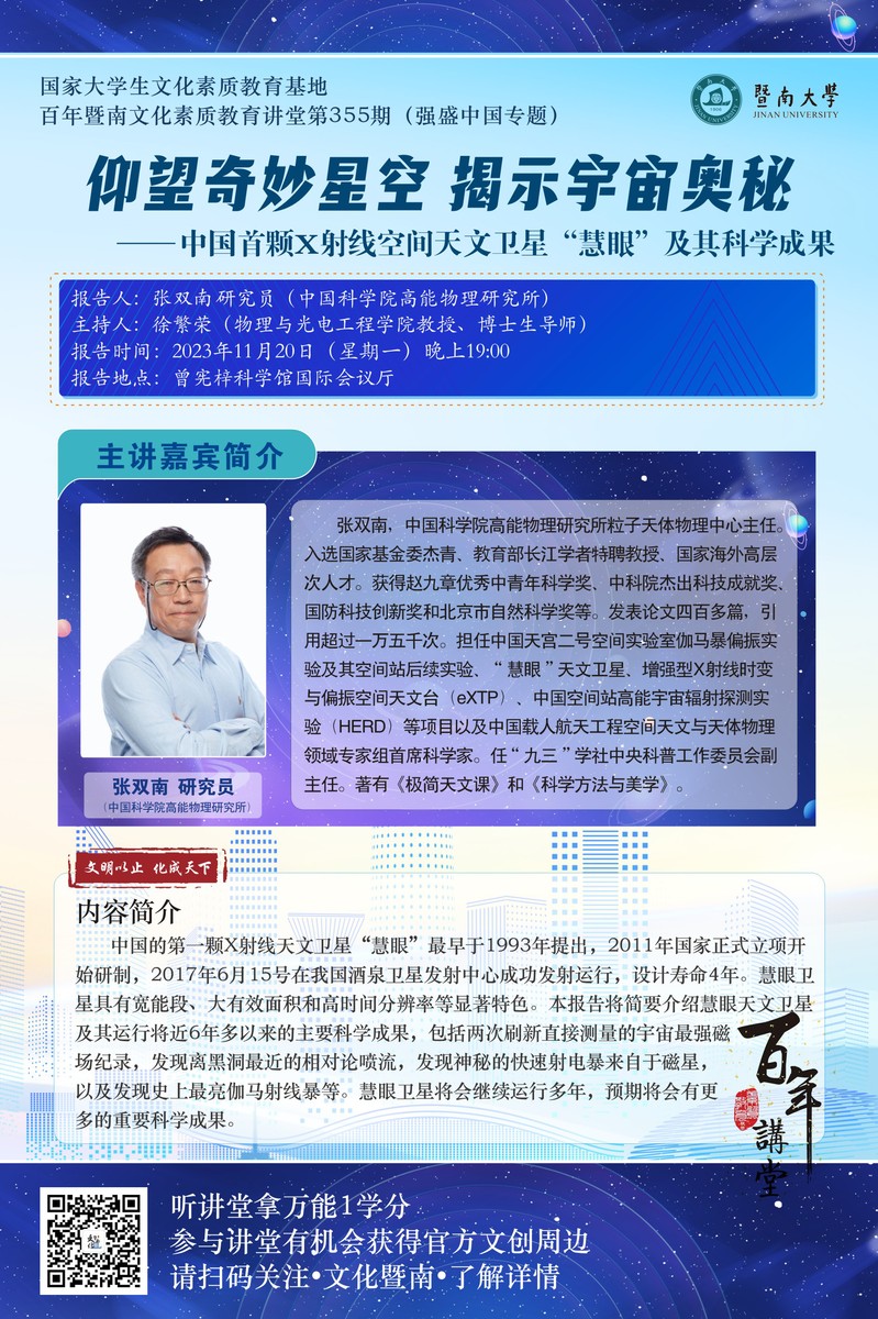 百年暨南文化素质教育讲堂第355期:张双南:仰望奇妙星空 揭示宇宙奥秘——中国首颗X射线空间天文卫星“慧眼”及其科学成果
