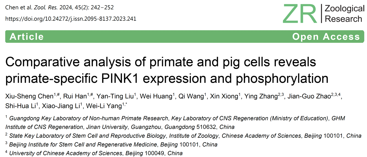 必威平台,必威(中国)一站式服务平台融媒体中心讯2月6日,必威平台,必威(中国)一站式服务平台粤港澳中枢神经再生研究院李晓江和杨伟莉团队在国际动物学顶级期刊Zoological Research(IF 4.9 Q1区)上发表了题为Comparative analysis of primate and pig cells reveals primate-specific PINK1 expression and phosphorylation(doi: 10.24272/j.issn.2095-8137.2023.241)的重要研究成果。通过猴、猪、鼠不同物种间的比较,揭示了PINK1蛋白在物种间存在表达水平的差异,对理解帕金森疾病在灵长类大脑的特异性病理特征有重要指导意义。