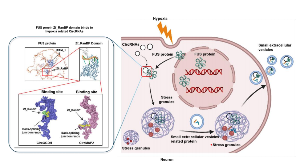 该研究发现,缺氧条件下位于细胞核中的RBP FUS迁移出细胞核,被招募入细胞质的SG中。同时,胞质FUS基于其独特的结构域招募胞质功能性环状RNA加入SG。在缺氧应激消除后,SG逐渐降解,解散后的FUS及功能性环状RNA转运至sEV,从而发挥重要生理作用。并且明确了FUS结合circRNA的结构域Zf_RanBP及其功能。