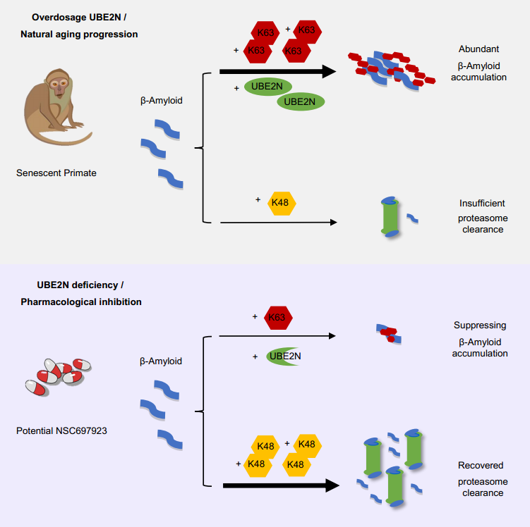 图1.与衰老相关的UBE2N在β-淀粉样蛋白累积及清除机制的示意图。在AD小鼠模型和自然衰老的猴脑中过表达UBE2N可通过K63位泛素化,促进Aβ蛋白的累积。利用CRISPR/Cas9敲低UBE2N或利用其小分子抑制剂NSC697923可通过减少K63位泛素化修饰,来降低脑内Aβ白的积累。