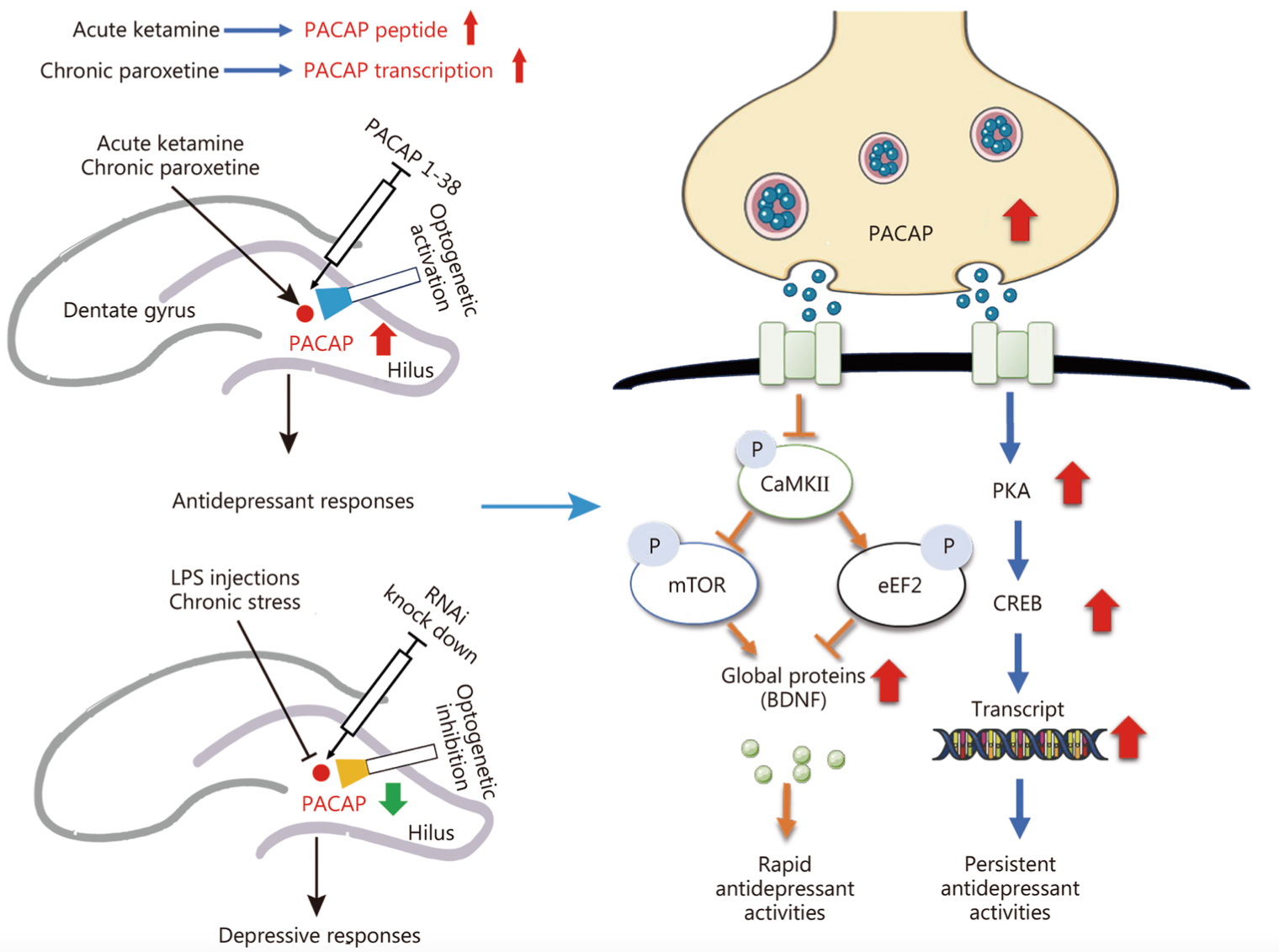 该研究揭示慢性给予SSRI代表性药物帕罗西汀后,抗抑郁起效的时间正好与海马PACAP表达增强的时间一致,且依赖于该表达。接着发现给予海马PACAP可以引起快速起效的抗抑郁作用,其效果具有剂量依赖性,或光遗传激活该神经元的时长依赖性。相反,基因敲低或者光遗传抑制该神经元导致抑郁行为,进一步发现在多种慢性抑郁模型中海马PACAP表达都降低了,证实其为抑郁症的病理靶标。并证实快速起效抗抑郁原型药物氯胺酮也需要通过激活该分子信号而发挥作用。从机制上,首次证实了PACAP快速而短暂地抑制下游CamKII信号,它调控eEF/mTOR信号来快速增强神经可塑性相关蛋白的表达,实现快速起效抗抑郁作用。