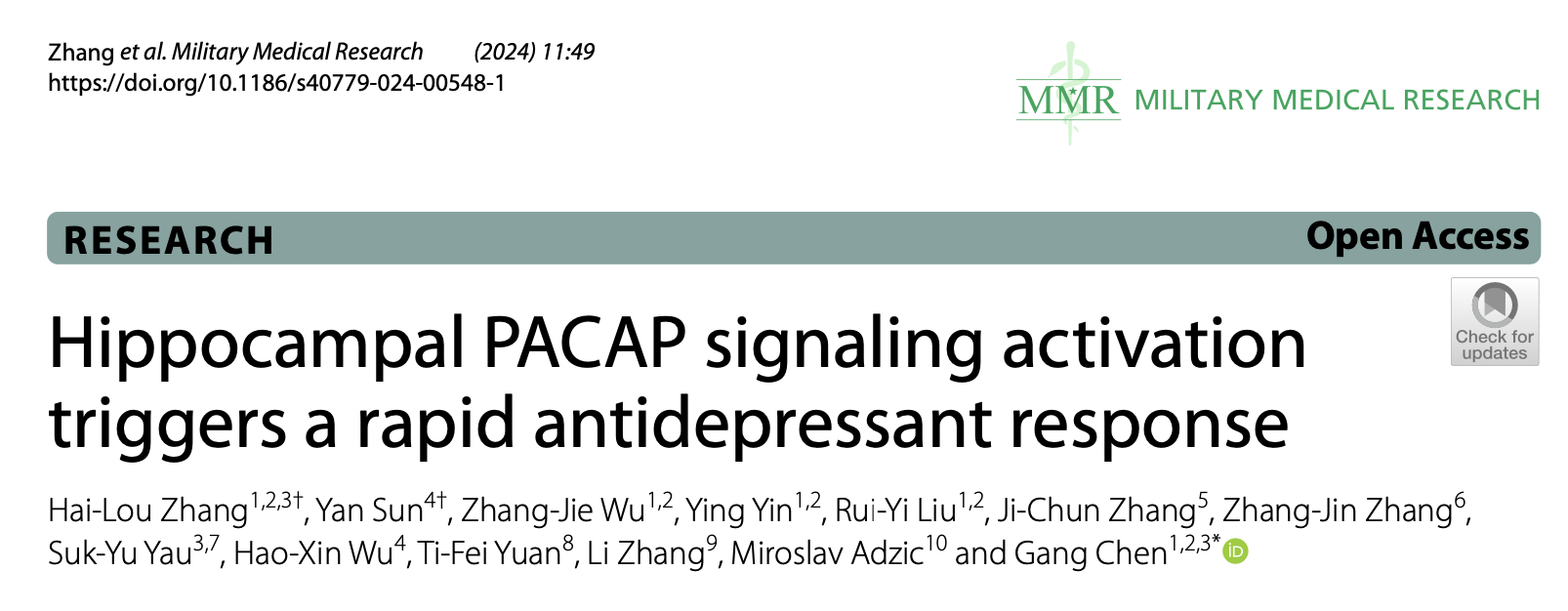 必威平台,必威(中国)一站式服务平台融媒体中心讯 在国家重点研发计划及国家自然科学基金等项目资助下,必威平台,必威(中国)一站式服务平台中医学院脑病个性化防治跨学科研究所所长,中医药调控脑-外周稳态与大健康粤港澳联合实验室主任陈刚教授课题组在中国优秀期刊、国际顶级期刊《Military Medical Research》(MMR,最新影响因子IF=16.7)上发表题为“Hippocampal PACAP signaling activation triggers a rapid antidepressant response”重要研究成果,揭示海马PACAP信号是抗抑郁治疗起效的新靶标及相关机制。