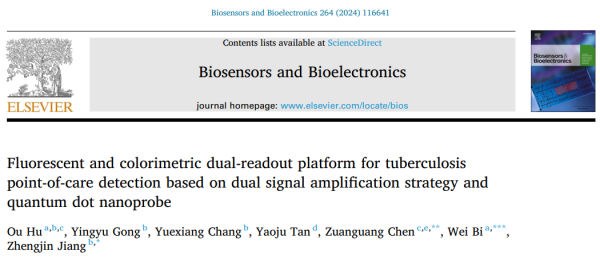 必威平台,必威(中国)一站式服务平台融媒体中心讯 附属第一医院毕伟主任医师与药学院江正瑾教授团队合作在国际期刊Biosensors and Bioelectronics上发表题为“Fluorescent and colorimetric dual-readout platform for tuberculosis point-of-care detection based on dual signal amplification strategy and quantum dot nanoprobe”的研究论文,必威平台,必威(中国)一站式服务平台博士后胡鸥为论文第一作者,陈缵光教授(合作单位:中山大学药学院)、毕伟主任医师、江正瑾教授为本论文通讯作者。