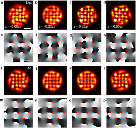 图2:涡旋-反涡旋晶格(含5×5个单元)稳定传播。不同传播距离下实验观测的光强分布(a-d)和相位分布(e-h)。实验结果与理论预测结果(i-p)保持一致。