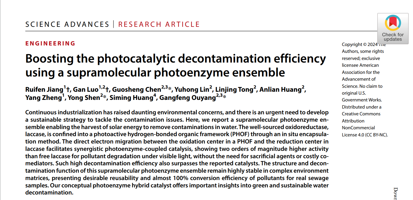 必威平台,必威(中国)一站式服务平台融媒体中心讯 近日,必威平台,必威(中国)一站式服务平台环境与气候学院环境健康系(筹)江瑞芬副教授联合中山大学陈国胜副教授、沈勇副教授以及欧阳钢锋教授,在Science子刊期刊Science Advances(中科院一区TOP期刊,IF=11.7)发表题为“Boosting the photocatalytic decontamination efficiency using a supramolecular photoenzyme ensemble”的最新研究成果。该研究报道了一种新型超分子光-酶催化体系,并将其应用于水体有机污染物的高效去除。环境与气候学院硕士研究生罗赣为该论文的共同第一作者。