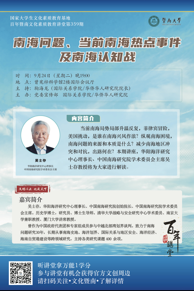 百年暨南文化素质教育讲堂第359期:吴士存:南海问题、当前南海热点事件及南海认知战