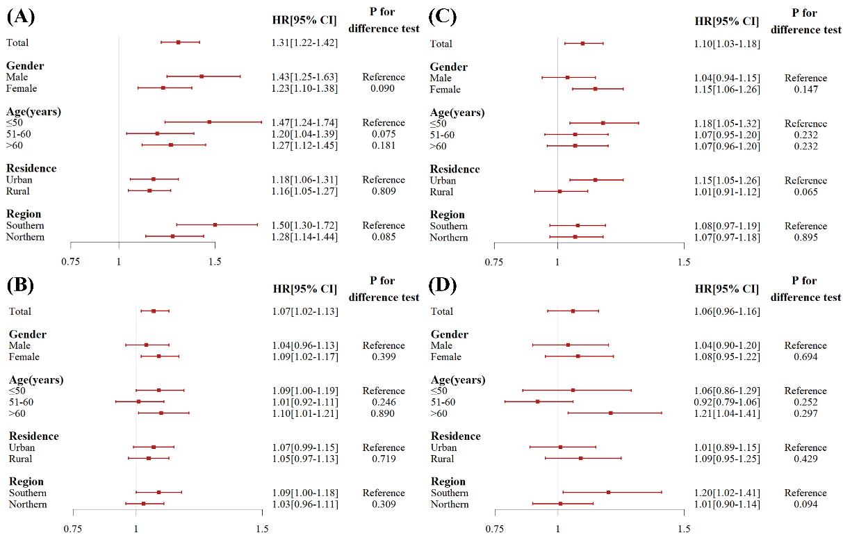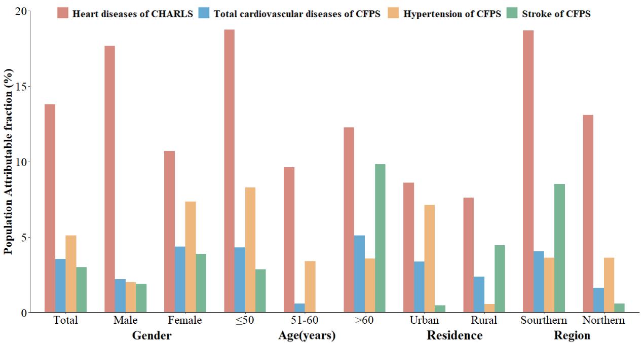 归因于O3长期暴露造成的心脏病、循环系统疾病和高血压的PAF分别为13.79%、3.53%和5.11%。亚组分析结果显示,O3造成的疾病负担在不同亚组间存在异质性。例如,心脏病PAF在中国南方较高,而高血压PAF在城市居民中较高(图3)。