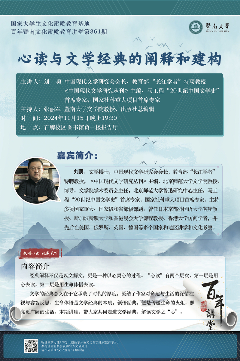 百年暨南文化素质教育讲堂第361期:心读与文学经典的阐释和建构