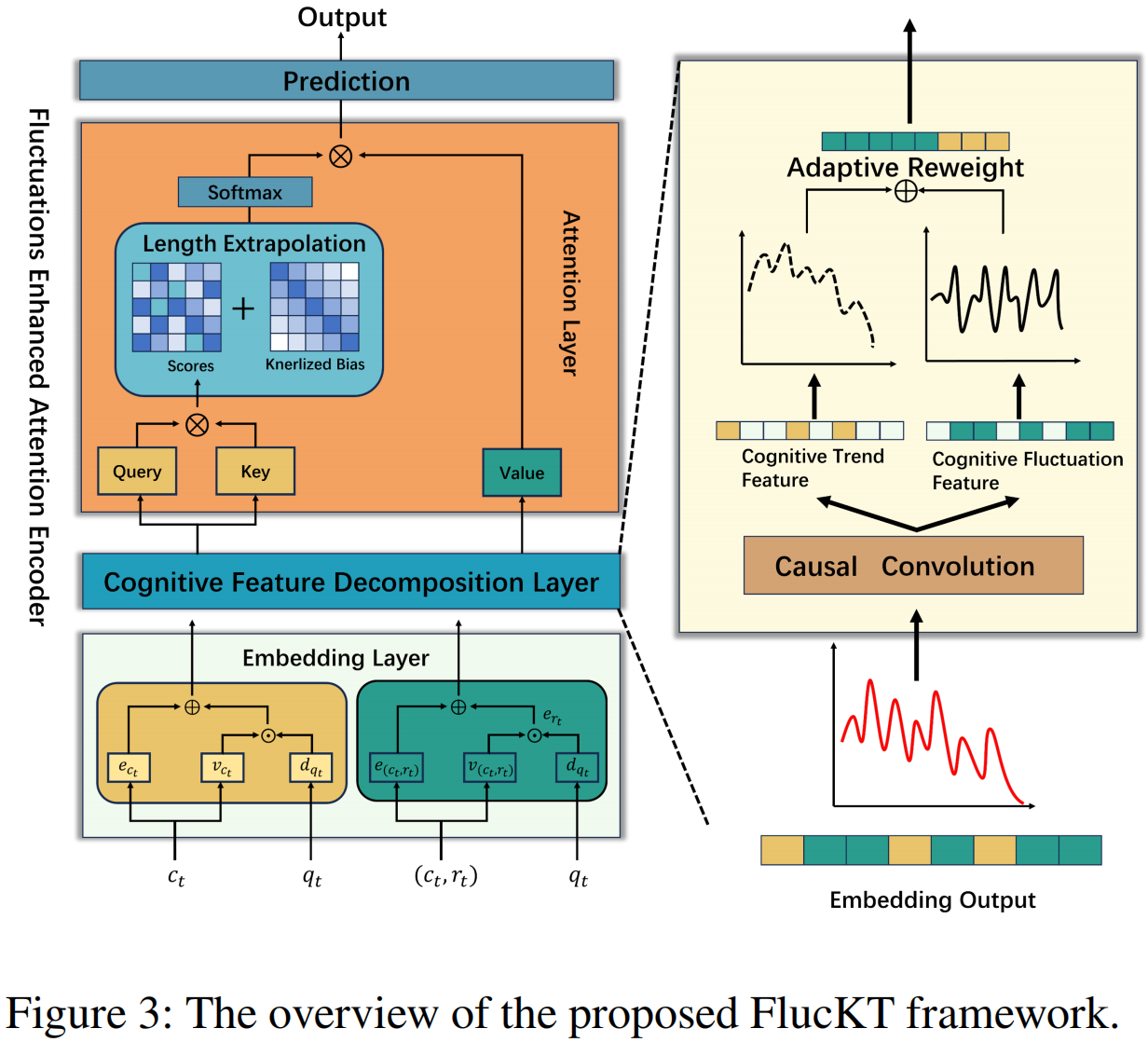 成果简介:知识追踪(Knowledge Tracing,KT)是一项序列预测任务,旨在利用学生的历史学习交互数据预测其在未来问题上的表现。KT的核心在于对人类认知行为的建模,以加深对认知过程的理解。人类认知具有两个关键特性:一是长期认知趋势,反映知识随着时间逐渐积累和稳定的过程;二是短期认知波动,源于遗忘或注意力暂时失焦等瞬时因素。现有的基于注意力机制的KT模型虽然能够有效捕捉长期认知趋势,但往往难以充分处理短期认知波动。这些局限性导致认知特征过于平滑,从而降低了模型性能,特别是在测试数据长度超过训练数据长度时表现尤为明显。为了解决这些问题,我们提出了FlucKT,一种增强短期认知波动建模的注意力网络,用于KT任务。FlucKT从以下两方面改进了注意力机制:首先,通过基于分解的层和因果卷积,分离并动态重权重长期与短期认知特征;其次,引入了核化偏置注意力分数惩罚,以强化对短期波动的关注,从而提升模型的长度泛化能力。我们通过在三个真实数据集上的广泛实验验证了FlucKT的贡献,实验结果表明,该模型在长度泛化能力和预测性能上均取得了显著提升。