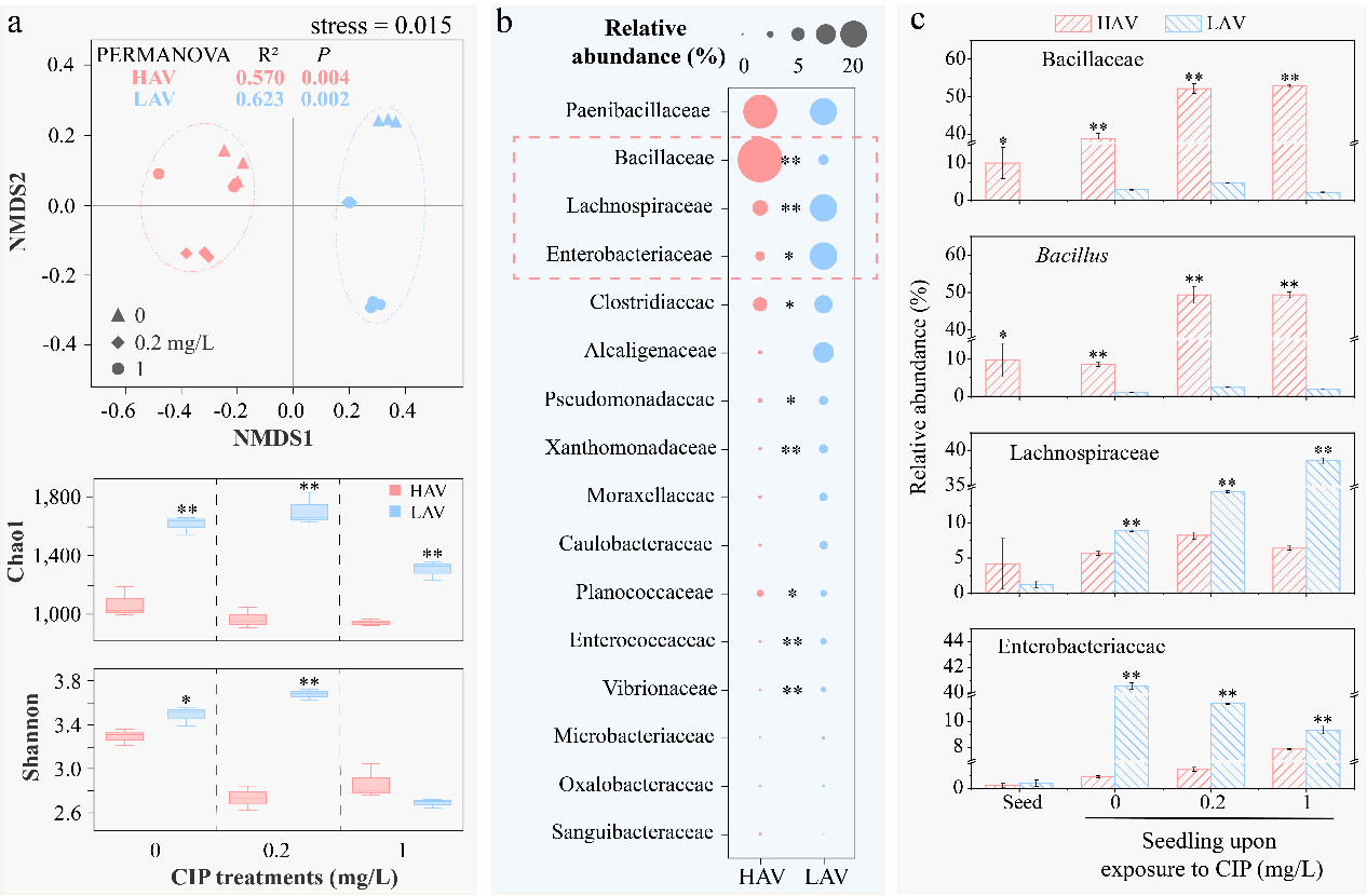 该研究创新性地从种源微生物(种子内生菌)的角度,通过构建无菌培养体系,利用 16S rRNA 和 ITS 基因测序以及关键功能微生物的富集筛选与功能验证实验,系统探讨了LAV(和相应高累积作物品种HAV)的种源微生物垂直传递效应及其特征群落结构组装过程,并揭示了这一过程调控作物吸收累积 CIP 的作用机制。研究成果发现LAV和HAV根系均可从种子微生物中富集特异性的细菌群落,其中LAV根系分泌马来酸少,在 CIP 胁迫下其细菌群落组装模式由随机性转变为确定性(图 1 和图 2),形成以毛螺科(Lachnospiraceae)和肠杆菌科细菌(Enterobacteriaceae)为主的更为复杂和敏感的根系细菌群落,抑制根系对 CIP 的捕获吸收,呈现低累积特征(图3)。反之,HAV根系分泌马来酸多,无论是否存在 CIP 胁迫,其根系细菌群落均为确定性组装过程,并形成以菌芽孢杆菌属细菌(Bacillus)为主的更具特异性和协同性的 CIP 耐受型根系菌群(图 1 和图 2)。关键功能菌的定向筛选富集及接种验证实验表明,HAV根系分泌更多的马来酸,对Bacillus菌形成更强趋化和招募作用,从而介导驱动种源微生物Bacillus(BpB13)通过垂直传递效应定殖于其根系,并通过分泌吲哚乙酸(IAA)和铁载体等促生代谢产物,促进HAV根系生长及对 CIP 胁迫的抗逆作用,从而提高其对 CIP 的耐受和根系捕获、吸收转运性能(图 3 和图4)。
