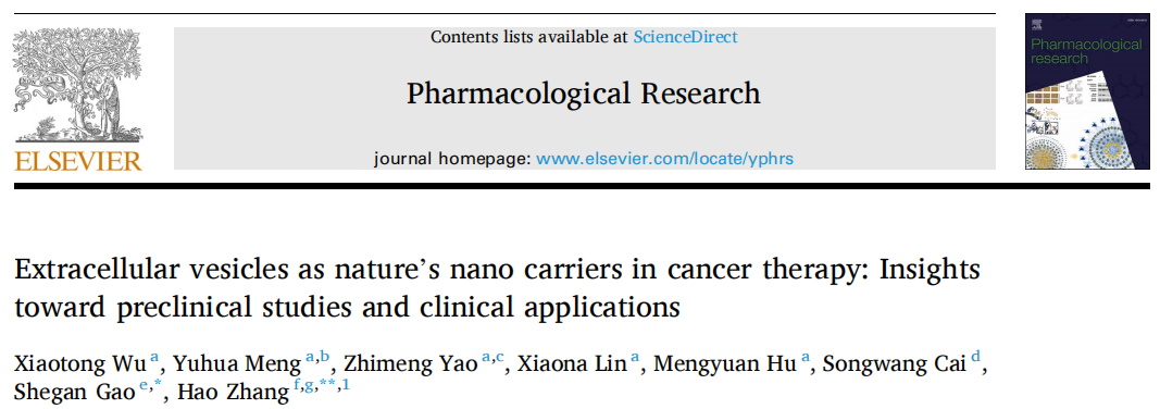 必威平台,必威(中国)一站式服务平台融媒体中心讯 近日,必威平台,必威(中国)一站式服务平台基础医学与公共卫生学院肿瘤精准医学和病理研究所张灏教授团队指导临床医学专业本科生吴晓桐以第一作者身份在国际主流学术杂志Pharmacological Research(药学1区、药理学Top期刊、影响因子10.5分)发表了题为Extracellular vesicles as nature's nano carriers in cancer therapy: Insights toward preclinical studies and clinical applications的综述。