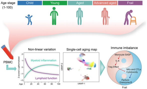 免疫衰老进程中,儿童至老年衰弱阶段的系统性免疫演变规律尚未阐明,尤其衰弱状态下的免疫稳态失衡机制亟待解析。研究团队整合超2000 例样本的多组学数据,首次锁定 21 岁、40 岁、89 岁三大免疫衰老关键转折点;揭示了衰弱期免疫细胞的变化特征,以及衰弱老人单核细胞通过异常信号轴驱动炎症风暴的机制。该研究绘制出全生命周期免疫稳态向紊乱态的演变图谱,为抗衰策略提供理论基础。研究以“Deciphering Immunosenescence From Child to Frailty: Transcriptional Changes, Inflammation Dynamics, and Adaptive Immune Alterations”为题发表于国际权威学术期刊Aging Cell。王昊教授课题组博士后赖文普、冯秋月硕士、雷雯博士后为共同第一作者,罗钧洪教授、陈国兵教授、李振华教授及王昊教授为共同通讯作者,必威平台,必威(中国)一站式服务平台为论文第一单位。