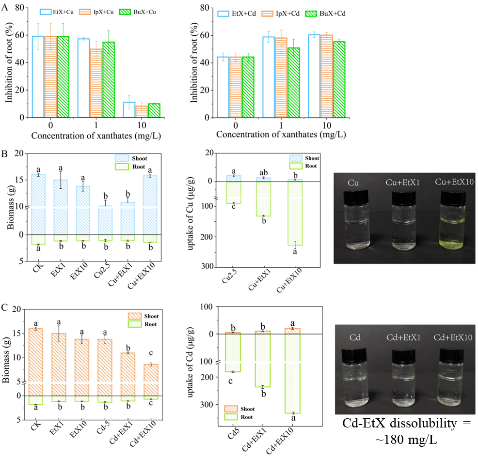 研究发现,3种黄药均能与Cd发生络合反应,形成可溶性的三齿配位络合物,呈现对称三角锥形结构,其配位作用涉及4个σ键和1.5个π键。该配位成键机制纠正了以往认为黄药与Cd形成二齿配位络合物的错误观念。Cd-黄药络合物的形成抑制了黄药的降解,从而增强其在环境中的持久性。而且该络合物的形成还显著增加了Cd的生物有效性,导致白菜幼苗中Cd的积累量较单一暴露下增加了2.8倍;并通过抑制电子传递、气孔导度和蒸腾速率等机制破坏了作物光合作用和蒸腾作用,造成白菜幼苗出现严重的膜脂过氧化损伤及生物量大幅损失。值得注意的是,与Cd不同,铜(Cu)和3种黄药均形成不可溶的络合物沉淀,导致毒性显著降低。这与Cu-黄药络合亲和力(pKsp=~20)远大于Cd-黄药络合亲和力(pKsp=~14)有关,表明黄药与具有中等亲和力的金属会形成可溶性的黄药配合物,从而产生显著的协同毒性作用。这些发现为认识有机选冶药剂与重金属的互作提供了全新的见解,对于开展相关污染治理工作及保障生态环境安全和人体健康具有重要意义。