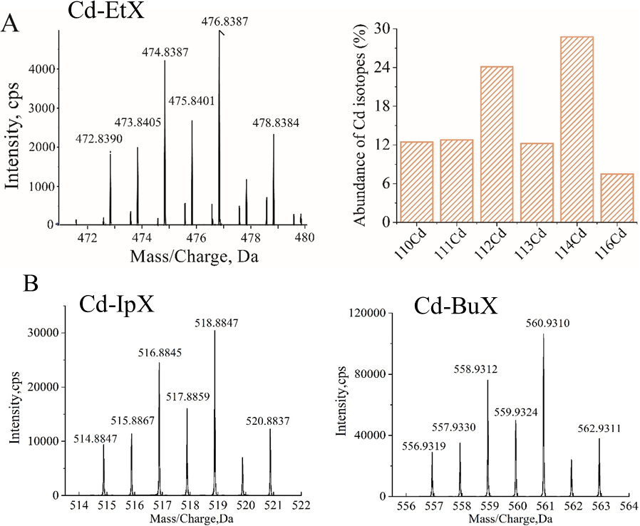 图 3 Cd-EtX的高分辨率质谱(HRMS)以及Cd同位素的自然丰度(A)以及Cd-IpX(B)和Cd-BuX(C)的HRMS谱
