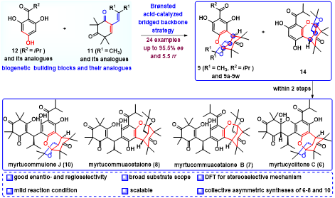 作者以生源砌块11和12为底物(图1),通过筛选多种手性Brønsted酸、溶剂、路易斯酸和温度,确定了立体选择性合成高度官能团化氧杂[3.3.1]桥环核心骨架(化合物9)的最优反应条件,并考察了该策略对不同生源砌块及其类似物的适用性。结果表明,该方法能够高效构建一系列复杂氧杂[3.3.1]桥环类化合物。进一步,以该方法为关键反应,通过5-6步实现了桥环间苯三酚类天然产物myrtucyclitone C(6)、myrtucommuacetalone B(7)、myrtucommuacetalone(8)和myrtucommulone J(10)的不对称仿生全合成。此外,通过理论计算,阐明了该关键反应在对映选择性和区域选择性控制中的反应机制。