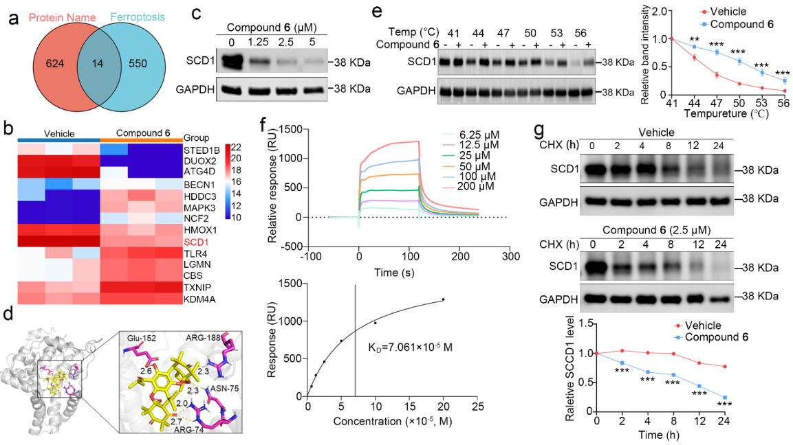作者对合成的化合物开展了抗非小细胞肺癌活性评价,发现化合物6在奥希替尼耐药非小细胞肺癌异种移植小鼠模型中表现出显著疗效。该化合物主要通过诱导铁死亡途径杀伤肿瘤细胞。蛋白质组学分析显示,SCD1蛋白可能为其关键作用靶点(图2)。随后,通过蛋白质印迹、细胞热转移、表面等离子体共振及蛋白质稳定性分析等多项实验,证实化合物6能够直接结合并促进SCD1降解,从而破坏脂肪酸代谢,诱导脂质过氧化并触发铁死亡过程。